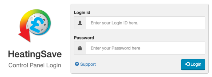 Once you have connected to your HeatingSave system you will be prompted with a login form. Just enter in your Login ID and password and click on the Login button. If you need assistance from HeatingSave support, click the support link and pass the information onto the technician. This will give them access to your system remotely without giving out any passwords.